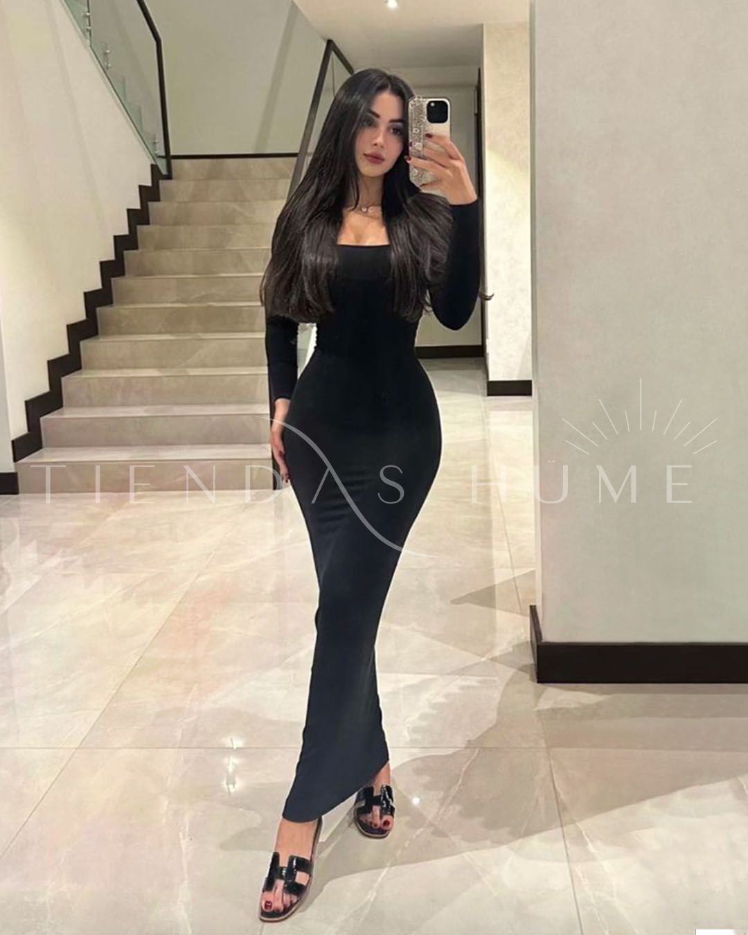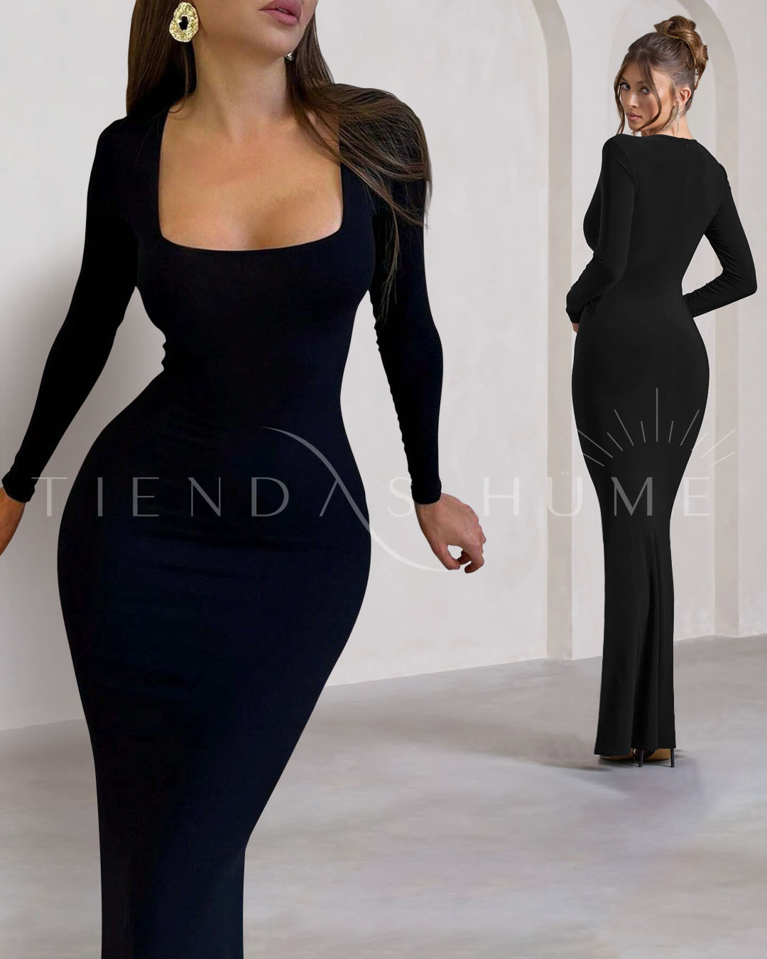 Este es un vestido largo con mangas y pecho semi descubierto de una sola pieza.